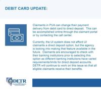 Pandemic relief claimants can change their payment delivery from debit card to direct deposit by going to the online portal, or contacting the call center.
