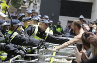 Dozens gathered around the statue of wartime Prime Minister Winston Churchill and the Cenotaph war memorial, both boarded up.