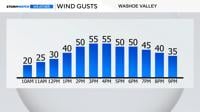 Gusty winds are the other side of this system. There will be more wind than anything else in Reno, Carson City, Fallon, and Fernley on Wednesday. Wind gusts will top 30mph, and wind prone areas could see wind gusts in the 50’s. The wind machine will be cranked on high by Wednesday afternoon, as the front gets closer. Once the front passes through wind speeds will ease.