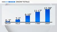 Snow totals will range from six to ten inches at lake level, to over a foot in the High Sierra.