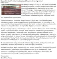 A message from the Carson City Sheriff's Office says that detectives, school resource officers, and patrol deputies worked overnight to identify the source of the threat. Around 4 a.m., they located the original social media post containing the threatening message.Â