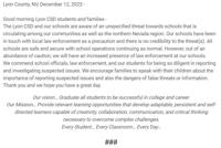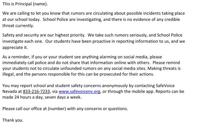 The schools adds, "Safety and security are our highest priority. We take such rumors seriously, and School Police investigate each one. Our students have been proactive in reporting information to us, and we appreciate it."