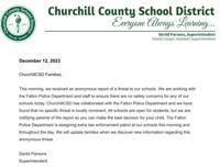 The Churchill County School District says it received an anonymous threat. They are working with the Fallon Police Department and "found that no specific threat is locally imminent." All schools in the district are open for the day.Â