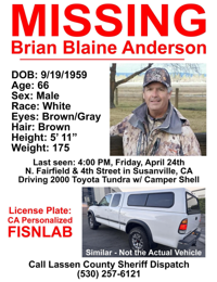 According to a Facebook post, Anderson was last seen at North Fairfield & 4th Street on Friday, April 24th. He was driving a 2000 Toyota Tundra with a camper shell and the license plate, FISNLAB.