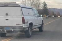 The GMC pickup truck has a white utility shell with unknown Nevada plates.Â