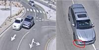 There is significant damage on the suspect car in traffic camera footage of the front right side of the bumper.