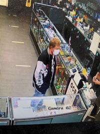 The first suspect had red hair and was wearing a black and grey style letterman jacket with red writing on the back and white skulls on the front, blue jeans and a medical grade face mask.Â