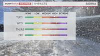 Wind is another impact with this storm. A Wind Advisory is posted for the Truckee Meadows through 3 pm Tuesday, as wind gusts could top 40mph. They’ve already reached 50 mph at the Reno Airport Tuesday morning. Wind gusts could top 80 mph at the ridgetops. Strong winds will also lower visibility along our mountain passes because of the snow. Wind speeds will ease behind the front later this evening.