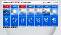 Snow totals will reach a foot in the high Sierra at the Crest, especially south of Lake Tahoe. Only a couple inches of snow will fall at lake level, and 8-12 inches could fall above 7000’. Nothing more than a dusting could accumulate in Virginia City.