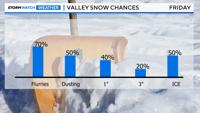 While the wind will help to increase temperatures and evaporate any remaining puddles, the cold air coming in from the north could also drop temperatures enough to have snow. At the same time, warm sub tropical moisture will be moving in. As the less dense warm air goes over the cold air, temperatures will have a hard time rising if it continues to precipitate. With that being said, if wind speeds are strong enough, temperatures could still be in the 40s Friday morning. So it’s a battle between the wind and the colder air mass moving in. Most of the moisture will be gone by the time the snow level reaches the valley floor Friday morning, so any snow that does fall will be light. Frozen puddles will also be an issue. Don't forget Thursday morning either. There's a 20% chance of slick roads in the valley then as well.