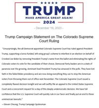 “A majority of the court holds that Trump is disqualified from holding the office of president under Section 3 of the 14th Amendment,” the court wrote in its 4-3 decision.