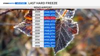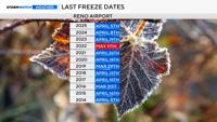 Reno usually sees its last hard freeze on April 8th, but a couple of years ago, it happened on April 19th. This is only the middle of April, so while we will drop below freezing on Friday morning, more active weather is in the forecast next week, too.