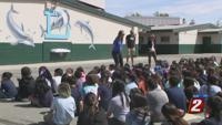 The mural, painted by local artist Beverly Caputo, depicts several dolphins playing in the surf and faces the playground, giving all students an opportunity to enjoy it every day.