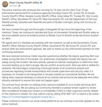 The active #manhunt still continues this morning for 35-year-old Eric Abril. Over 70 LE personnel from numerous agencies actively saturated east #Roseville and parts of #Rocklin overnight, along with 24-hour air surveillance. LATEST DETAILS: https://t.co/HseM6u55PO #PlacerCounty