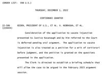 The Supreme Court on Thursday said the Biden administration program to cancel student loans will remain blocked for now, but the justices agreed to take up the case in late winter.