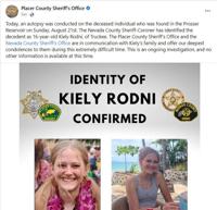 The Placer County Sheriff's Office confirmed on Tuesday that the body found by divers on Sunday is in fact, 16-year-old Kiely Rodni.