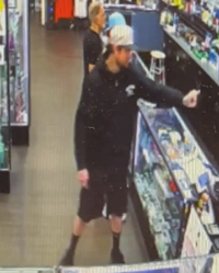 The suspect was last seen wearing a grey hat, a black t-shirt, black shorts, and black shoes.