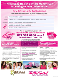 Then in Reno, on Friday, October 4 the Mammovan will be offering exams outside the Atlantis Casino Resort Spa in the West Parking Lot, at 3800 S. Virginia St. from 07:40 a.m. until 3:20 p.m. (closed for lunch from 12 p.m. to 1 p.m.)