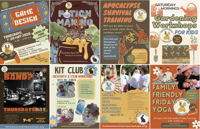 The workshops will cover a wide range of topics, including game design, apocalypse survival, potion making, creative writing, new car ownership, zine and collage, small business marketing for children and teens, gardening for toddlers, starting a first band, family-friendly Friday yoga, and anatomy for children.