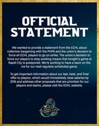 The Tahoe Knights Monsters and the ECHLÂ say all of its players are being forced to go on strike, causing them to postpone Saturday night's game in Rapid City, South Dakota.