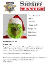 The Lyon County Sheriff's Office released a wanted poster of this suspect, named The Grinch.