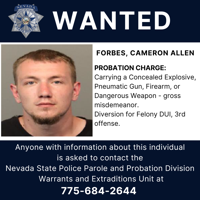 Anyone with information about Cameron Forbes is asked to please contact the Nevada State Police Parole and Probation Division Warrants and Extraditions Unit at 775-684-2644.