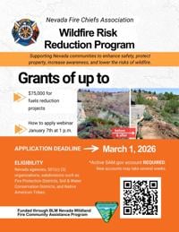 Grants are offered up to $75,000, and applications are accepted from January 5 through March 1. Another grant is being offered for up to $10,000 aimed at providing education and outreach for property owners or the public, according to the Nevada Fire Chiefs Association.