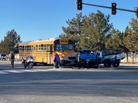 Washoe County deputies say a blue truck ran a red light while turning left onto Calle De La Plata - at the same time, the gray truck was turning right when both trucks collided. Deputies say the trucks then hit the school bus.