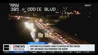 One person was hospitalized following a crash between a motorcycle and a car on westbound I-80 west of USA Parkway.
