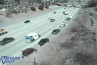 The right-most two eastbound lanes were closed for a while so that crews from the Nevada Department of Transportation (NDOT) could repair the damage.