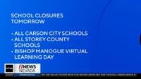Winter weather is forcing the closure of all schools in Storey County and the Carson City School District on Tuesday, while Bishop Manogue Catholic High School will be doing a virtual earning day.