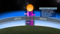 UV radiation is emitted by the sun, and travels through the atmosphere as non-visible light. The ozone is able to absorb some of the radiation but not all of it.