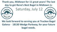 Truckee Bagel Company will close its Midtown Reno location on July 12, while continuing to serve customers at its longtime Galena shop located at 18130 Wedge Parkway in South Reno.