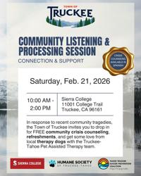 On Saturday, February 21, Sierra College Truckee Campus will host community grief support listening sessions from 10 a.m. to 2 p.m., with the Humane Society of Truckee-Tahoe providing pet-assisted therapy.