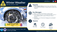 In an online post, the National Weather Service, Reno said, “Following the recent wintry precipitation, freezing fog may develop tonight into tomorrow morning, especially in the Sierra valleys. Please use caution if traveling through these areas, as roads may be slick and visibility may be reduced.”