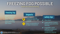 Freezing fog forms when temperatures drop to 32 degrees or below, and water droplets freeze on contact with surfaces. When that happens, visibility can quickly fall, and black ice can develop, especially on bridges and overpasses.