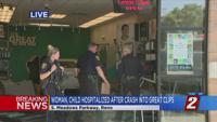 Officials tell our crew on scene that one child and one woman suffered injuries in the crash. They say the 8-year-old child was pinned underneath the car and the woman was pinned against the wall between the car and the building.Â