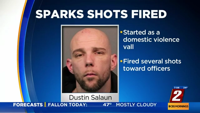 While officers were on scene, the suspect, 34-year-old Dustin Salaun left the apartment but when he saw officers outside, he went back inside where he allegedly fired several rounds in the direction of officers.