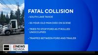 A crash in Tahoma, California near the South Lake Tahoe area resulted in the death of a person who ended up pinned between a truck and a tractor-trailer.