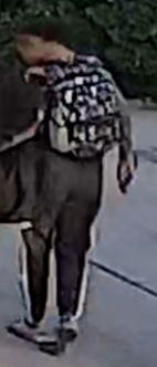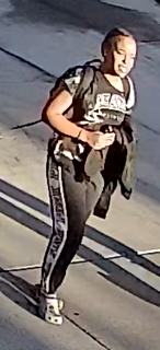 She is described as wearing a dark colored short-sleeved shirt, with a lightning bolt design on the front, dark colored “PINK” brand sweatpants, with white stripes and “PINK” brand lettering down the sides, and multicolored “Crocs” shoes.