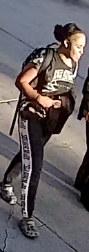 She was last seen wearing a grey and black hooded sweatshirt, green flared pants, and multicolored Crocs shoes. She has curly black hair.