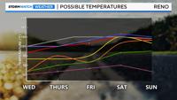 Models are in good agreement that it will be hot over the 4th of July, but some are hotter than others. There is an 80% chance of temperatures surpassing 95° during the later half of this week, with a 60% of reaching the triple digits. Saturday will be the hottest day of the week, with a 30% chance of reaching 105° at the Reno Airport. Keep in mind the airport is the hottest spot in the Reno area, and that’s where the records are kept. Our neighborhood communities will be at least a couple degrees cooler than the airport both during the day and at night. This is because of the heat island effect.