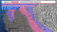 Friday’s storm is not as impressive as our most recent storm, but it is still a healthy looking system. Count on chain controls and delays throughout much of Friday, before drying out Saturday morning. There will be some spill over in the valley, with a mix of rain and snow possible. The precipitation will melt as it hits the ground, leading to wet roadways. Highs on Friday will be in the mid 40's for the Truckee Meadows. It won’t be a washout Friday, with a lot of dry time as well.