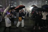 Over a hundred fans, including some who had failed to get tickets, stood outside the stadium with umbrellas to listen to the band perform.