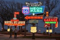 A median in Missouri is home to St. Robert Route 66 Neon Park, which features orphaned neon signs that once beckoned travelers to stop at certain sites and businesses along the highway. Often handcrafted, they weren’t only markers for motels, cafes and gas stations, but were also folk art and symbols of local culture.