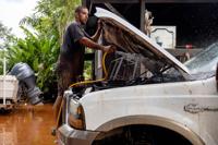 Philip Holman flushes mud from his lifted truck's engine bay the day after it was fully submerged by the fast-moving flood in Haleiwa, Hawaii Saturday, March 21, 2026.