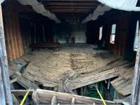A photo from the Fire Marshal's Office shows a chandelier and white bunting decorating the ceiling above the buckled floor boards, as well as stacked benches that had been used for seating for the wedding before the collapse.