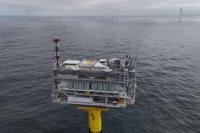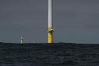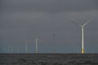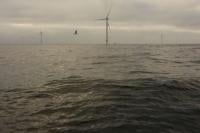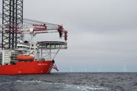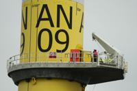 A ship that serves as a floating home base for technicians working on wind farms was next to one of the turbines on Thursday. The technicians had used the ship's gangway to walk onto the turbine and stood at its base, or foundation.