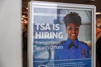 Signage reading "TSA is Hiring" at Philadelphia International Airport, Monday, March 23, 2026, in Philadelphia.