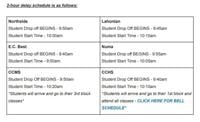 The Churchill County School District has announced that all schools will operate on a two-hour delay on Wednesday. Buses will run in accordance with this delay, with all pickups moving back two hours. Breakfast will not be served at any school. The district provided a breakdown of its delay schedule, which can be seen below.